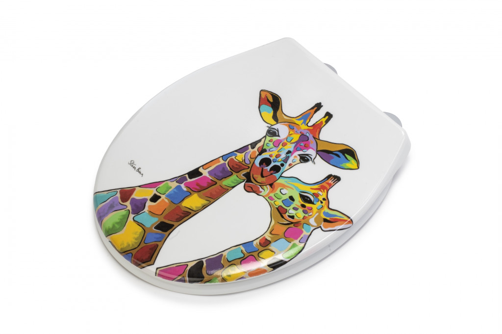 Enjoy a morning zoo with this vibrant toilet seat featuring original artwork from celebrated artist Steven Brown.