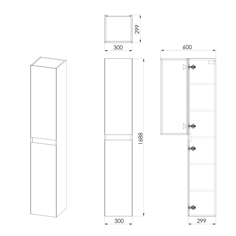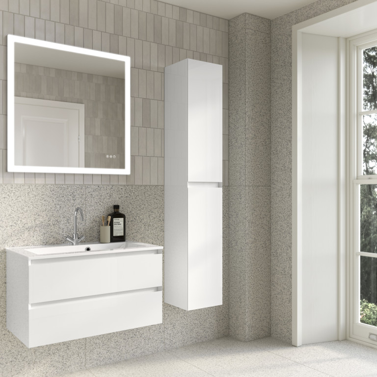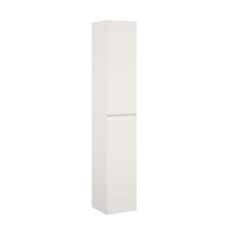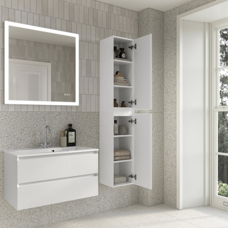 The Vernas wall unit is a chic and elegant companion to the Vernas vanity unit. Its design is characterised by a sleek profile, integrated handle and two doors revealing five fixed shelves.