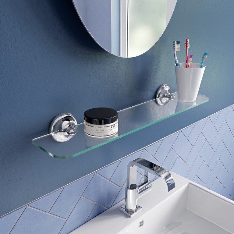 - Brackets adjust on towel rail and glass shelf to accommodate existing screw centres.