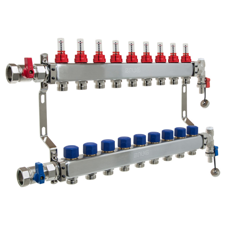 9 port stainless steel manifold comes with flow meter, isolation valves, drain off and manual air vents 626W x 320H x 90mmD