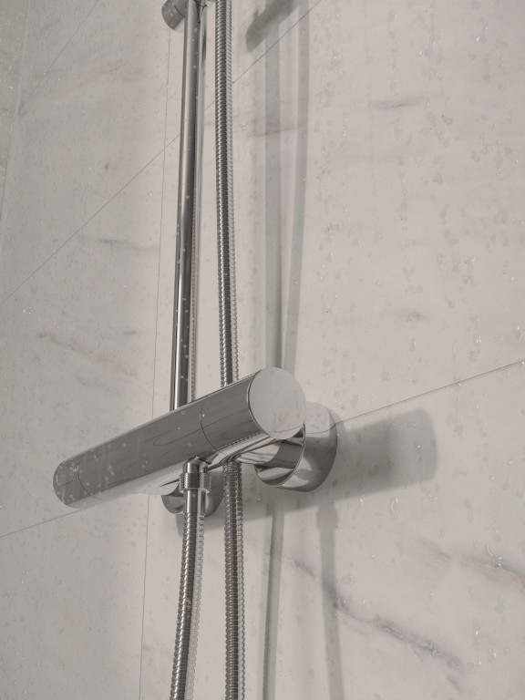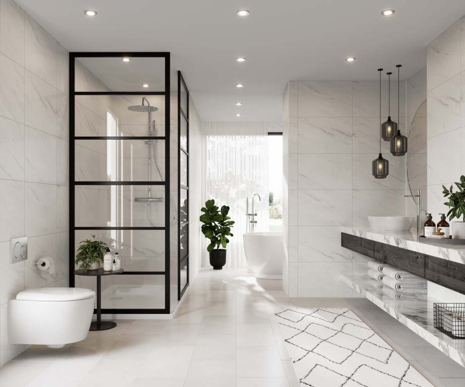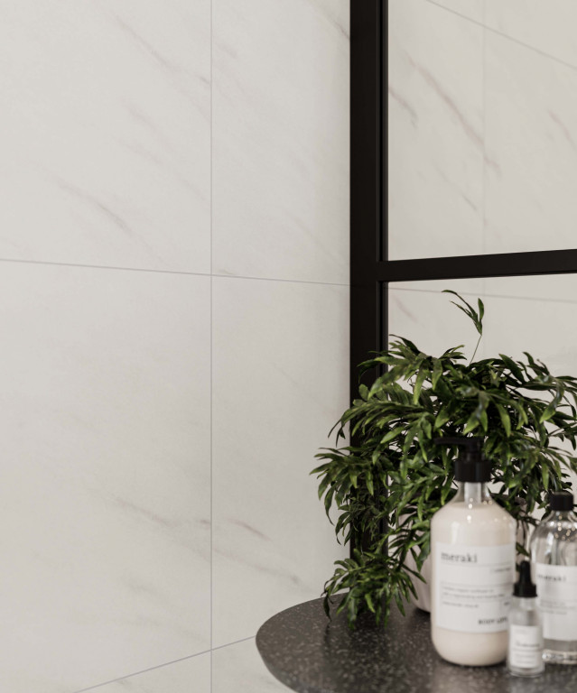This beautiful white marble produces a classic marble effect, with a depth and variation in shade that moves from grey to a hint of blush pink. The smooth matt finish of this tile effect panel creates an elegant feel. This décor works beautifully with black accessories.