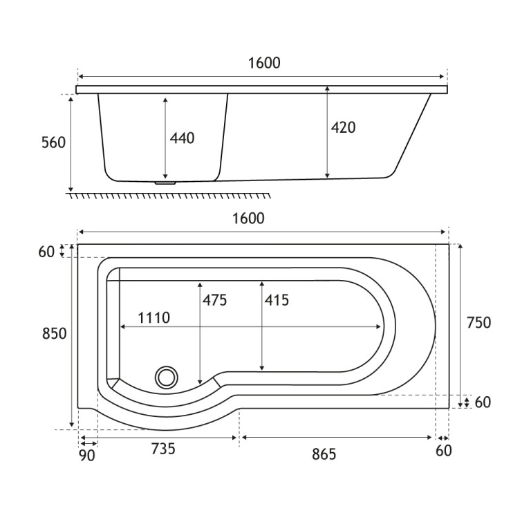 - Length: 1600mm, Width: 850mm, Internal depth: 440mm, Height: 560mm